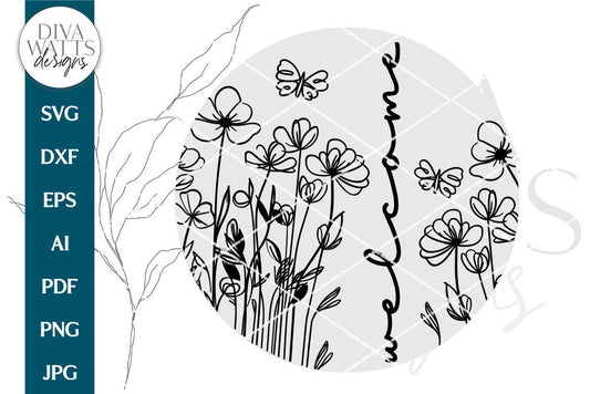 Welcome With Doodle Flowers SVG | Farmhouse Spring Welcome Design for Door Hanger | DXF and More Included