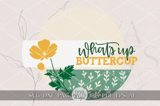 What’s Up Buttercup Round Door Hanger SVG, Spring Flower Door Sign Laser Cut File, Buttercup Floral Porch Decor, Layered DIY Wood Sign