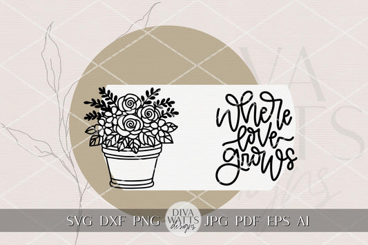Where Love Grows Round Door Hanger SVG for Laser Cutting, Floral Pot Sign Digital File, Farmhouse Spring Porch Decor DIY Laser Cut File