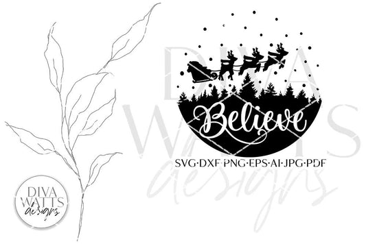 Believe SVG | Santa in Sleigh With Tree Silhouette Design