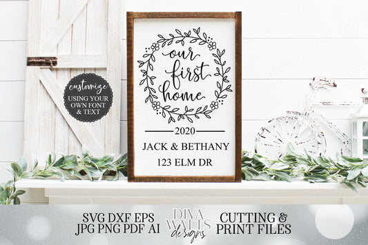 Our First Home | Farmhouse Style Wreath Cutting File and Printable | SVG DXF jpg and More! | Sign | Cutting Board | Housewarming Gift