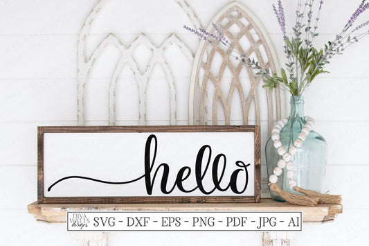 SVG | Hello | Cutting File | Door Mat Sign | Farmhouse Rustic | Bouncy Script with Long Tail | Vinyl Stencil HTV | Welcome Greeting | DXF ai