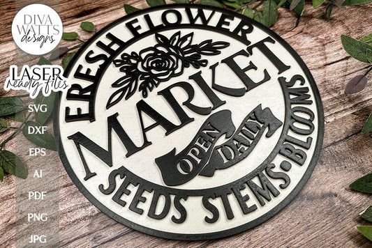 Fresh Flower Market Laser SVG | Glowforge Farmhouse Spring Gardening Round Sign Design | DXF and More