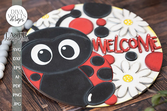 Welcome Glowforge Laser SVG Ladybug & Daisies Door Hanger Design Ladybug Sign SVG Laser File for Front Door Decor Ladybug Welcome Sign