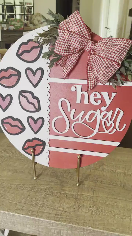 Hey Sugar SVG Laser Cut File, Valentine's Day Door Hanger Template, Kiss and Heart Round Sign Design, Glowforge & Xtool Compatible