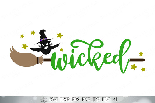 Wicked | Halloween Design | Witch Hat | Witch Broomstick | Cat | Bat | Halloween Shirt | Halloween Sign | Cutting File | SVG DXF and More!