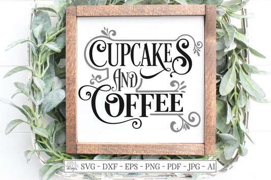 SVG | Cupcakes And Coffee | Cutting File | Vintage Style Flourishes Swirls Signage Sign | Farmhouse Rustic | Bar | Vinyl Stencil HTV | dxf