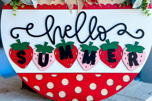 Hello Summer SVG, Strawberry Door Hanger Laser Cut File, 3D Layered Summer Sign, Seasonal Porch Decor, Glowforge, Xtool, Omtech