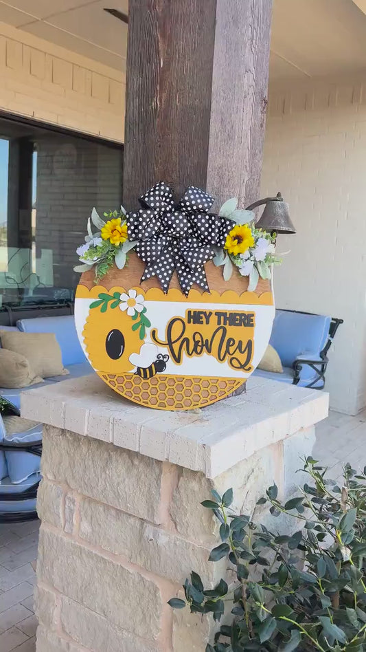 Hey There Honey SVG, Bee Door Hanger Laser Cut File, Beehive Round Sign, Farmhouse Porch Decor, Honeycomb Layered Sign, Glowforge xTool File