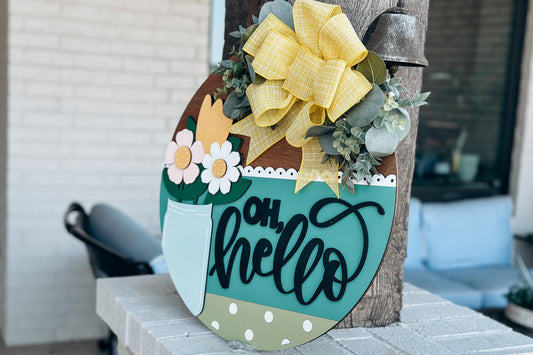 Oh Hello Mason Jar Door Hanger SVG, Floral Round Sign Laser Cut File, Spring Welcome Sign for Glowforge, Farmhouse Home Decor