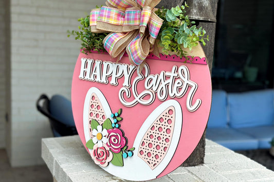 Happy Easter Bunny Ears Door Hanger SVG, Layered Laser Cut File for Glowforge Xtool, 3D Easter Sign SVG, Floral Bunny Porch Decor