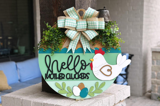 Hello Mother Cluckers Door Hanger SVG, Farmhouse Chicken Sign, Layered Laser Cut File, Rustic Round Wood Sign, Glowforge Xtool Cut File