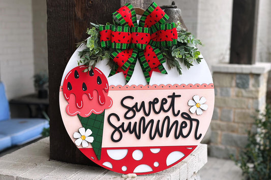 Sweet Summer Watermelon Ice Cream Door Hanger SVG, Layered Laser Cut File for Glowforge Xtool, Summer Porch Sign SVG, 3D Round Door Sign