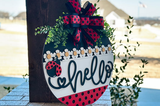 Hello Ladybug Door Hanger SVG, Round Laser Cut File for Glowforge, Customizable Farmhouse Welcome Sign, Spring Front Door Decor