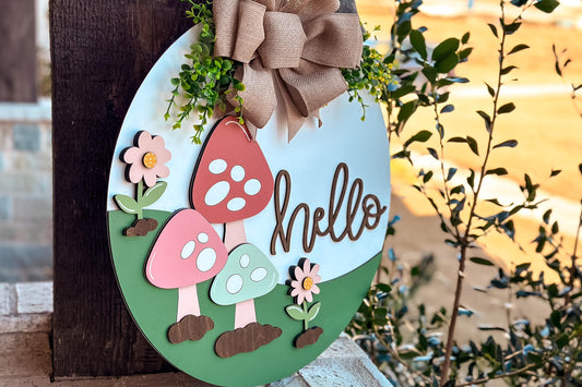 Hello Door Hanger SVG, Mushroom Round Laser Cut File for Glowforge, Customizable Farmhouse Welcome Sign, Spring Front Door Decor