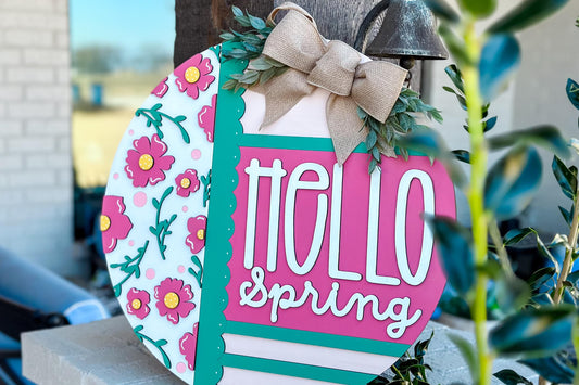 Hello Spring Door Hanger SVG, Round Laser Cut File for Glowforge, Floral Welcome Sign, Customizable Farmhouse Spring Decor