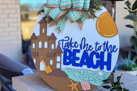 Take Me To The Beach Door Hanger SVG, Round Laser Cut File for Glowforge, Sandcastle Sign, Customizable Summer Design, Beachy Door Decor