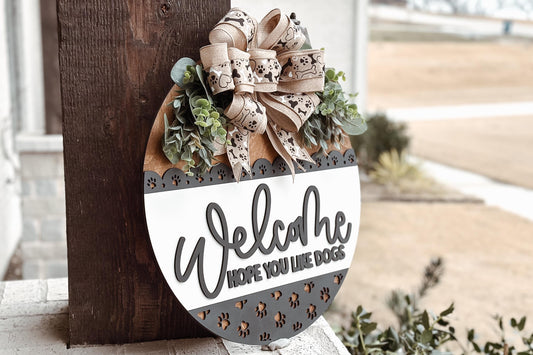 Welcome Hope You Like Dogs Laser Cut File SVG | Paw Print Round Door Hanger | Dog Lover Home Decor | Glowforge Xtool File | Dog Sign SVG