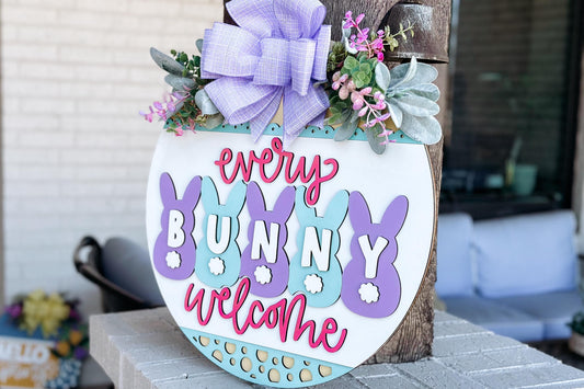 Every Bunny Welcome Door Hanger SVG, Easter Bunny Laser Cut File, Spring Layered Wood Sign Design, Glowforge SVG, Bunny Decor