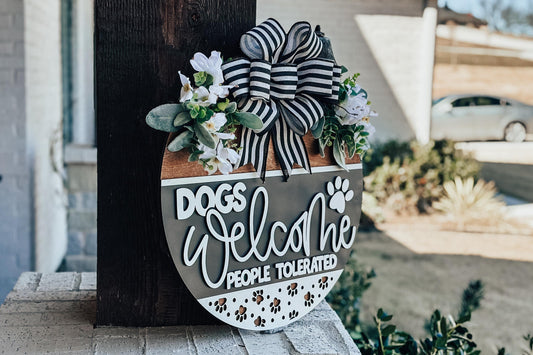 Dogs Welcome People Tolerated SVG, Funny Dog Door Hanger Laser Cut File, Paw Print Sign Design, Glowforge SVG, Pet Lover Decor