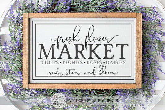 SVG | Fresh Flower Market | Cutting File | Peonies Roses Tulips Daisies | Seeds Stems Blooms | Frame | Spring Summer | Sign | Farmhouse |