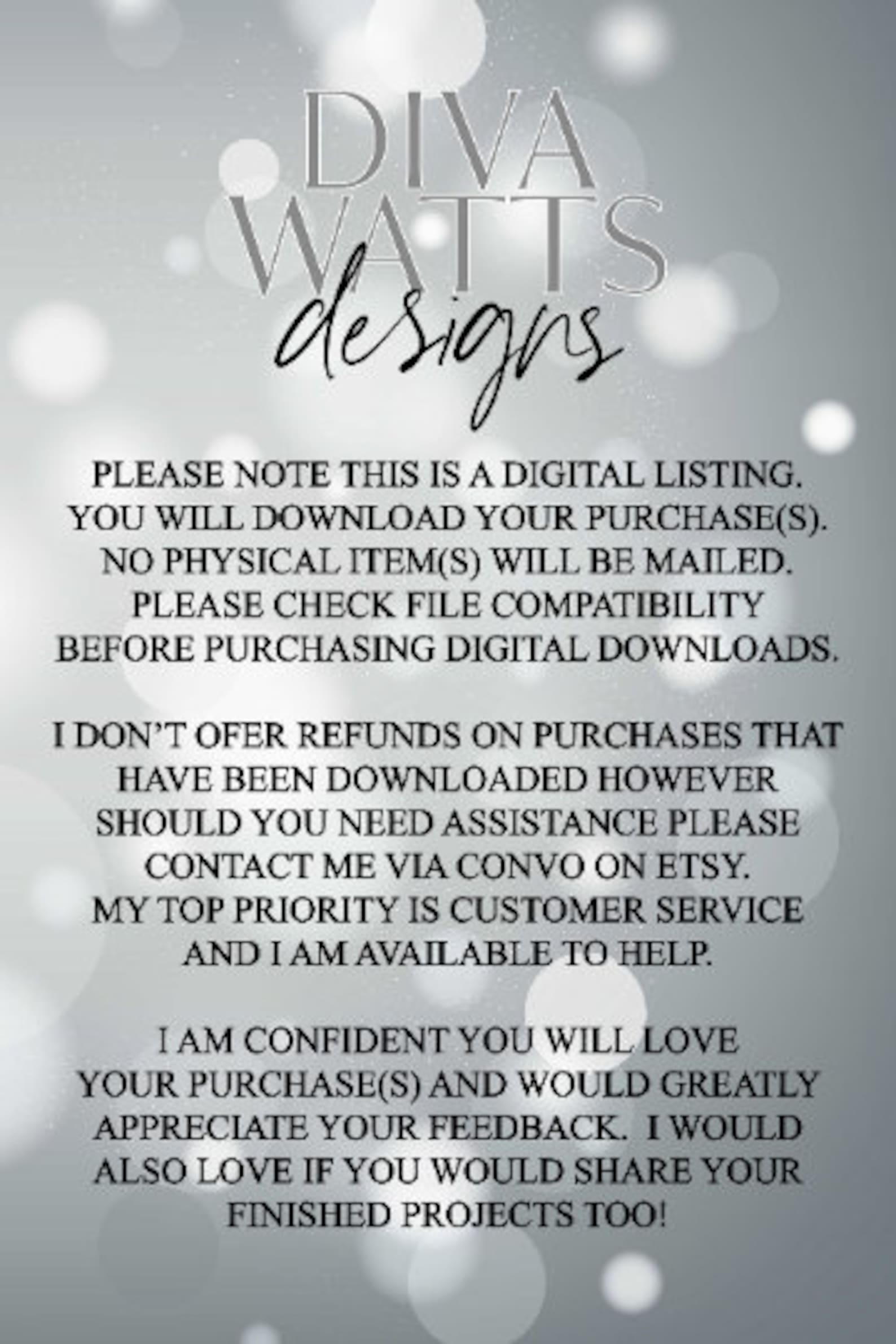Purchasing from Diva Watts Designs does not transfer the rights to the you, the buyer. Copyright belongs to Diva Watts Designs. By purchasing, you agree to all the terms stated above.