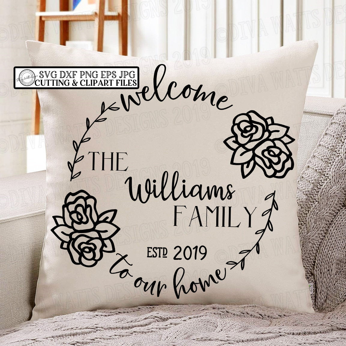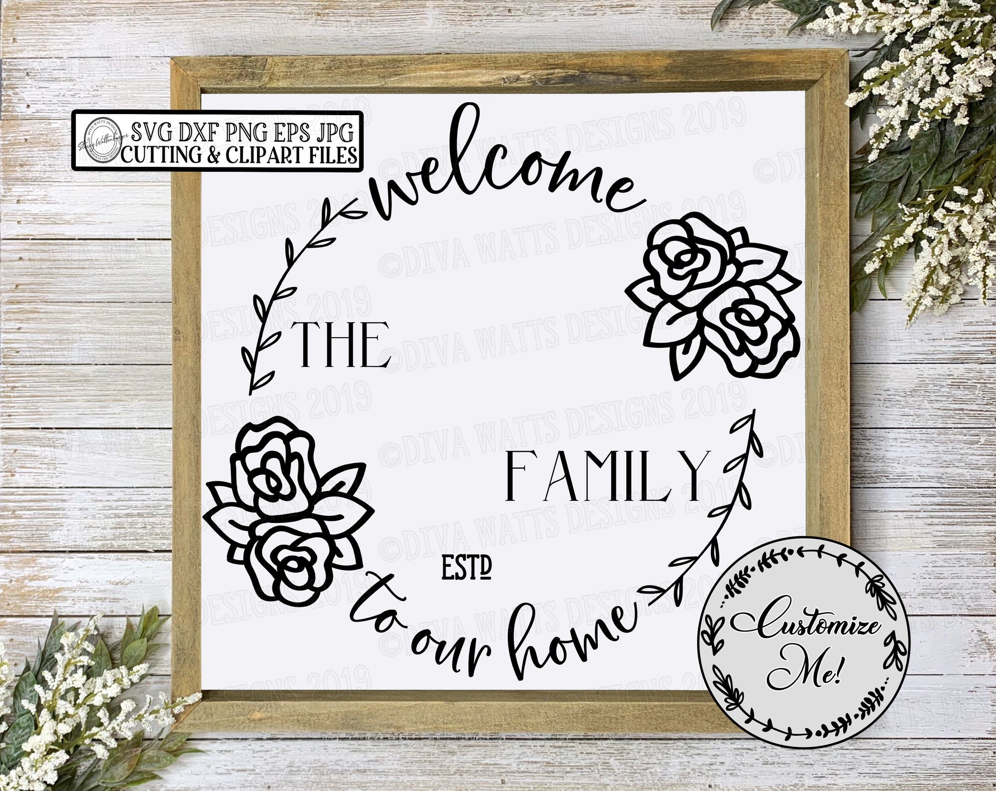 Sweet cutting file featuring a farmhouse wreath with the words "Welcome to our Home" and in the middle is "The" "Family" "Est.". You personalize with your own font. Perfect for signs, pillows, tea towels and so much more! Features roses on the wreath.