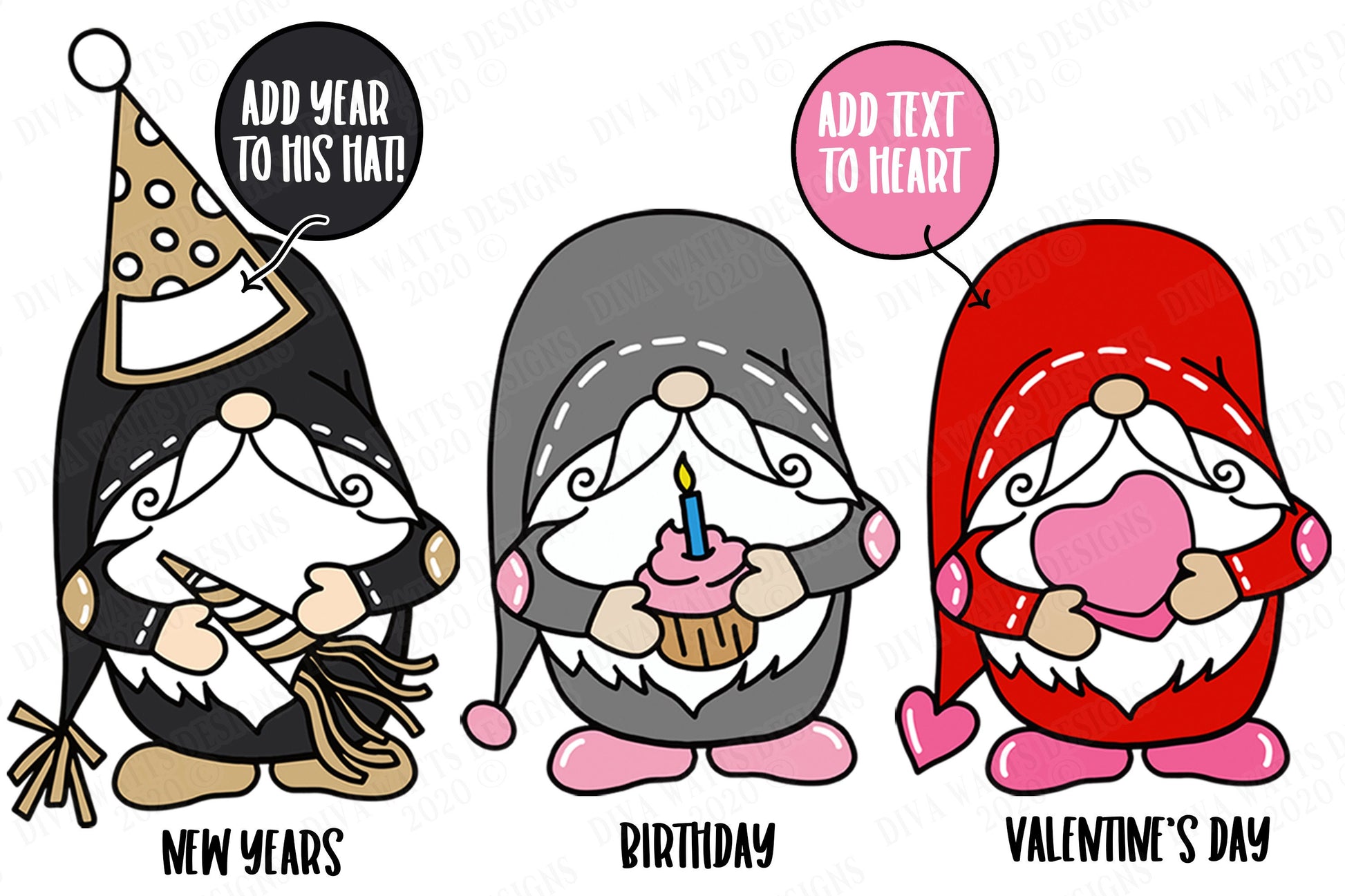 Great for clipart projects! Use your graphics program to recolor the gnomes if you wish!