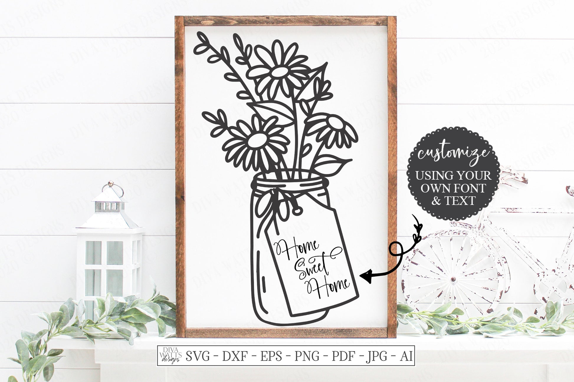 Hand drawn design features a mason jar with daisies and adorned with a tag that you can customize using your own font and text!
