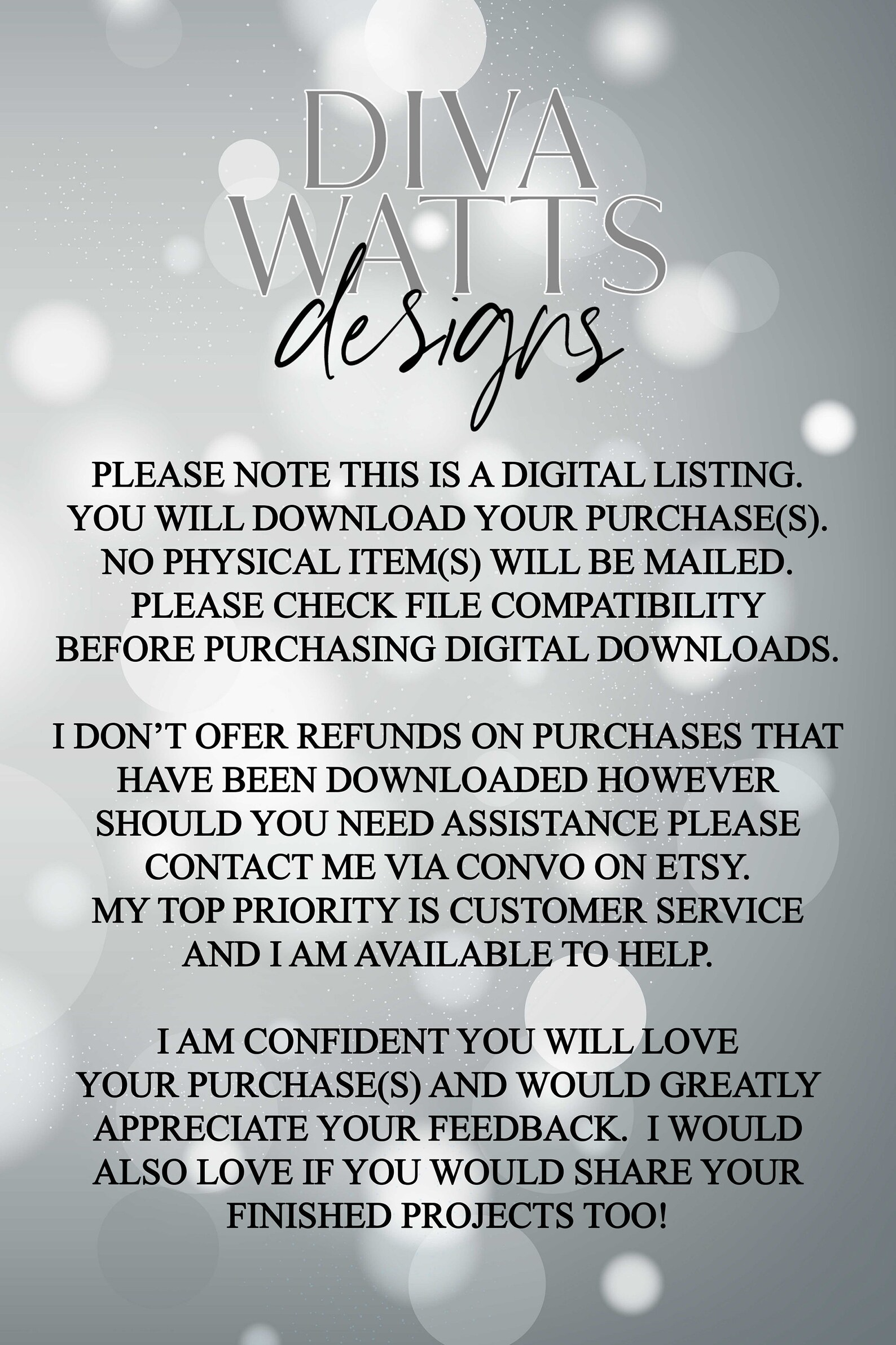 No refunds or exchanges allowed on digital items once they are downloaded. No exceptions. So please verify BEFORE you purchase, that you have the appropriate software. If on the rare occasion you have any problems please message me directly and I will do my absolute best to assist you.