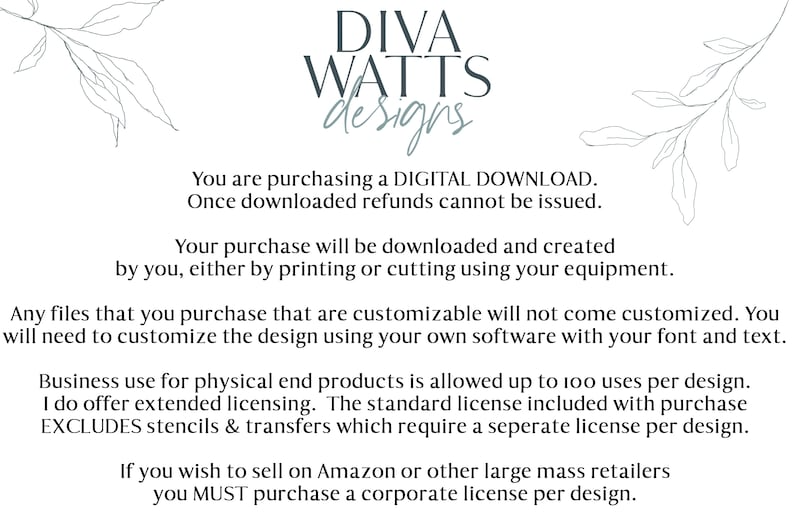 Create physical handmade products for small businesses UP TO 100 physical end products. However, I do offer an extended license beyond this number. (STANDARD BUSINESS USE DOES NOT INCLUDE CREATING VINYL DECALS, TRANSFERS OR STENCILS, OR OTHER “CRAFTING” TYPE PRODUCTS WHICH REQUIRE A SEPARATE LICENSE PER DESIGN. Don’t hesitate to get in touch with me to obtain this license.) If you have any questions, please reach out to me via message.